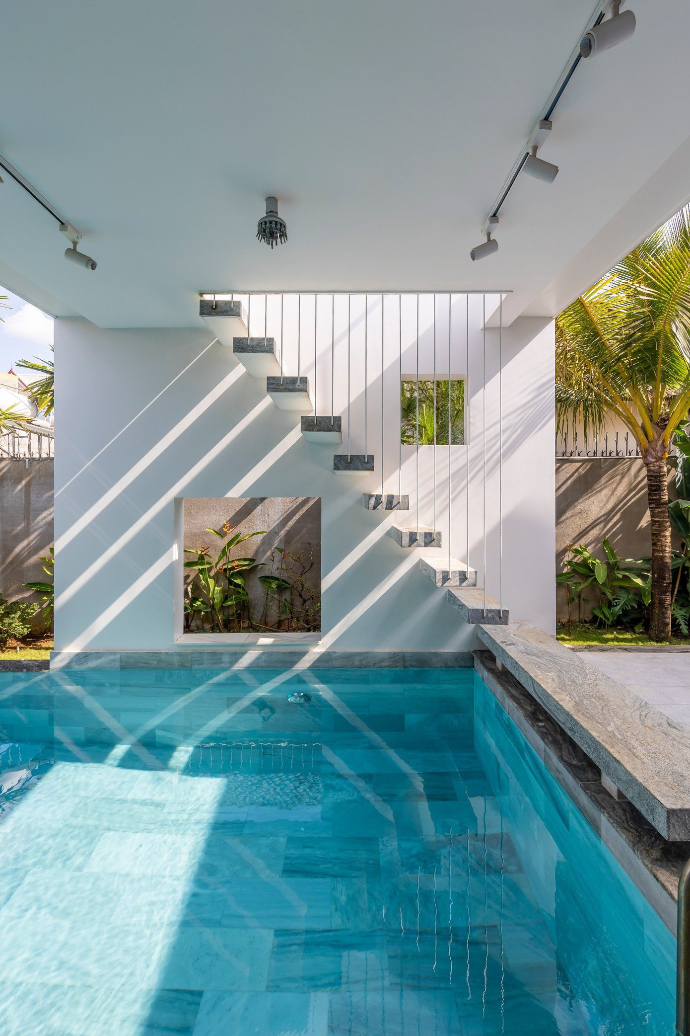 | Phần mái của hồ bơi không chỉ có tác dụng che chắn nắng mà còn có thể sử dụng làm nơi hóng mát lý tưởng, cầu thang dây cáp dẫn lên mái là điểm nhấn tạo nên sự nhẹ nhàng, bay bổng cho kiến trúc. |