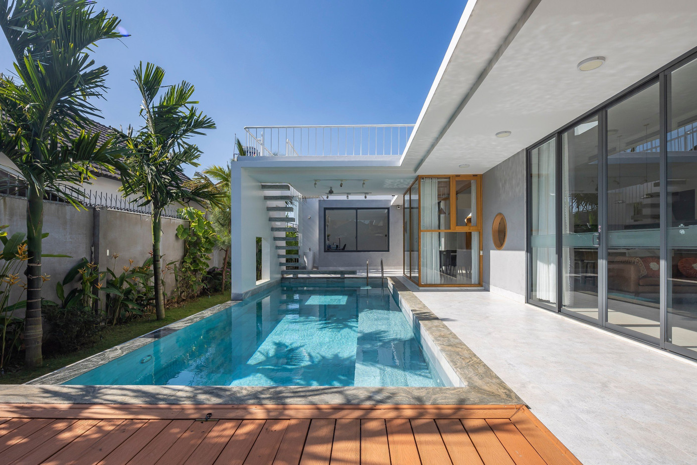 Điểm đặc biệt của ngôi nhà chính là vị trí hồ bơi được bố trí liền kề các không gian phòng khách, phòng ăn và phòng làm việc. Thiết kế này, vừa là biện pháp điều chỉnh vi khí hậu, cung cấp hơi nước, giảm nhiệt trong những ngày oi bức của vùng khí hậu Tây Nguyên.