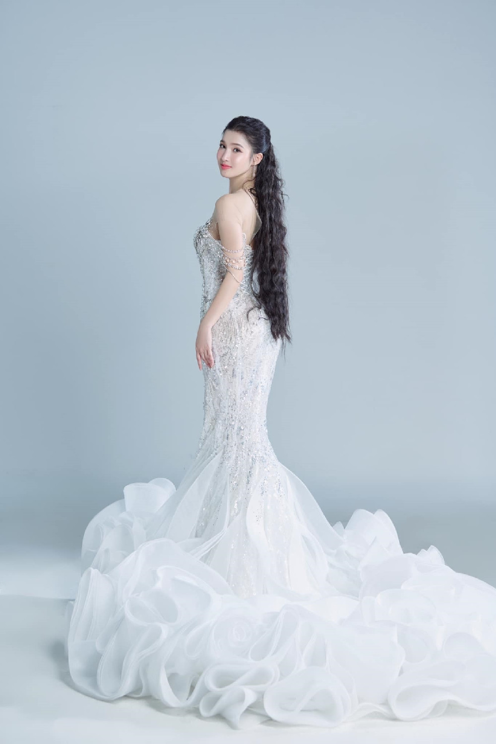 Thanh Vân là thiết kế thứ 2 mà Phương Nhi chuẩn bị cho đêm Chung kết Miss International 2023. Đây là mẫu dạ hội dáng đuôi cá có thiết kế chân mây bồng bềnh.