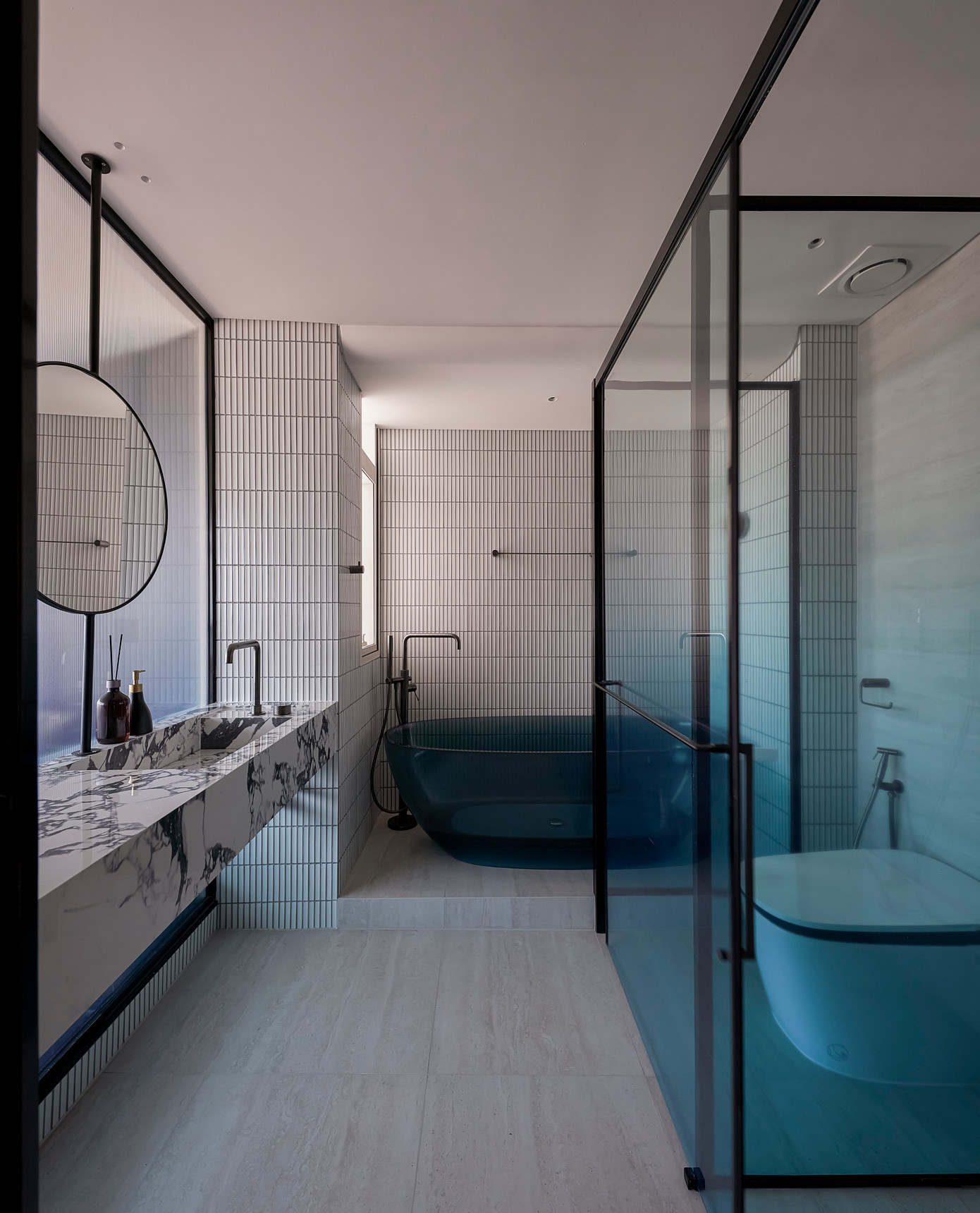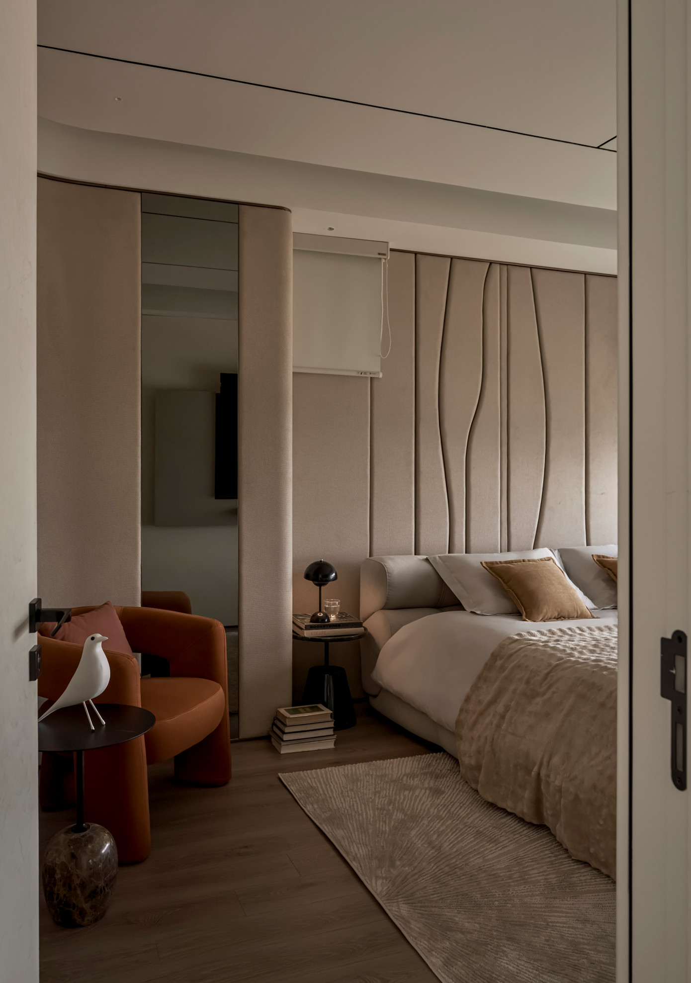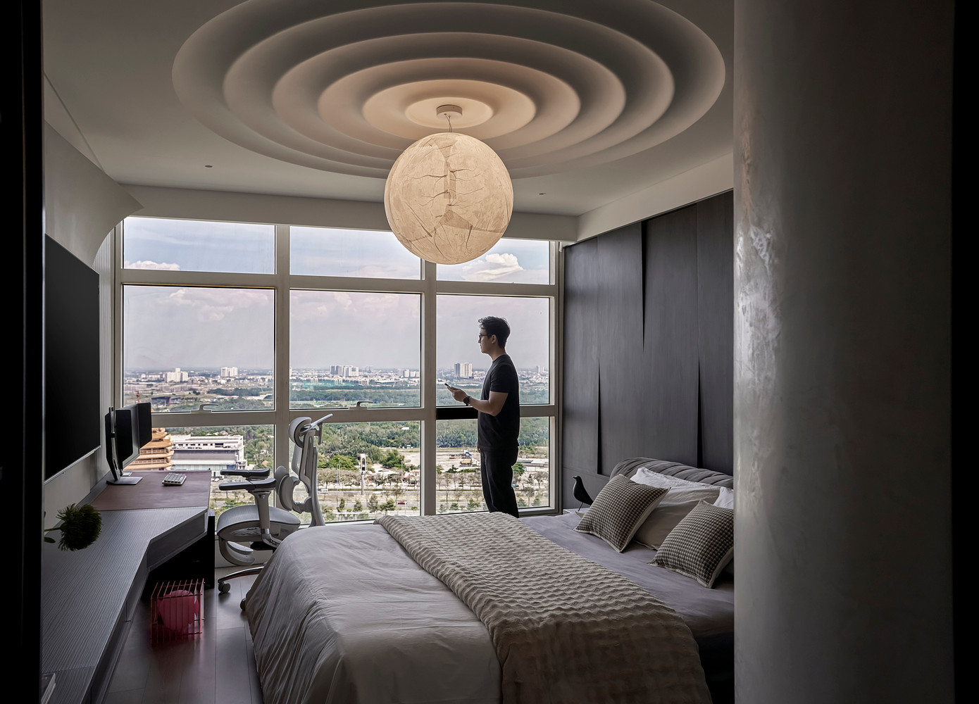 Tại các phòng ngủ, nội thất được thiết kế tối giản với đường nét mềm mại hơn. Trọng tâm là ánh sáng tự nhiên từ cửa sổ, nội thất tối giản,các nhà tắm rộng rãi lát đá, các hệ cửa kính phân chia khô ướt.