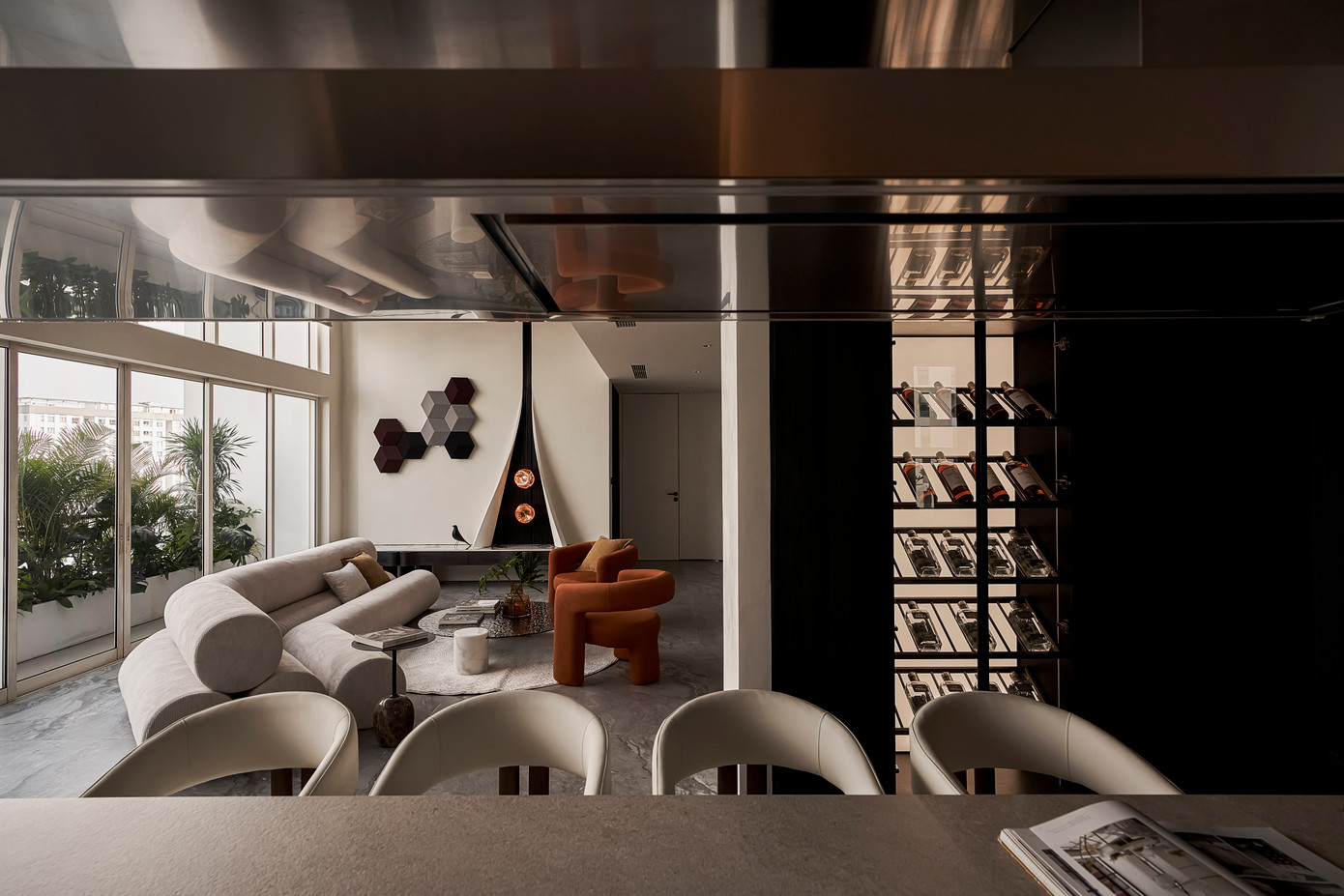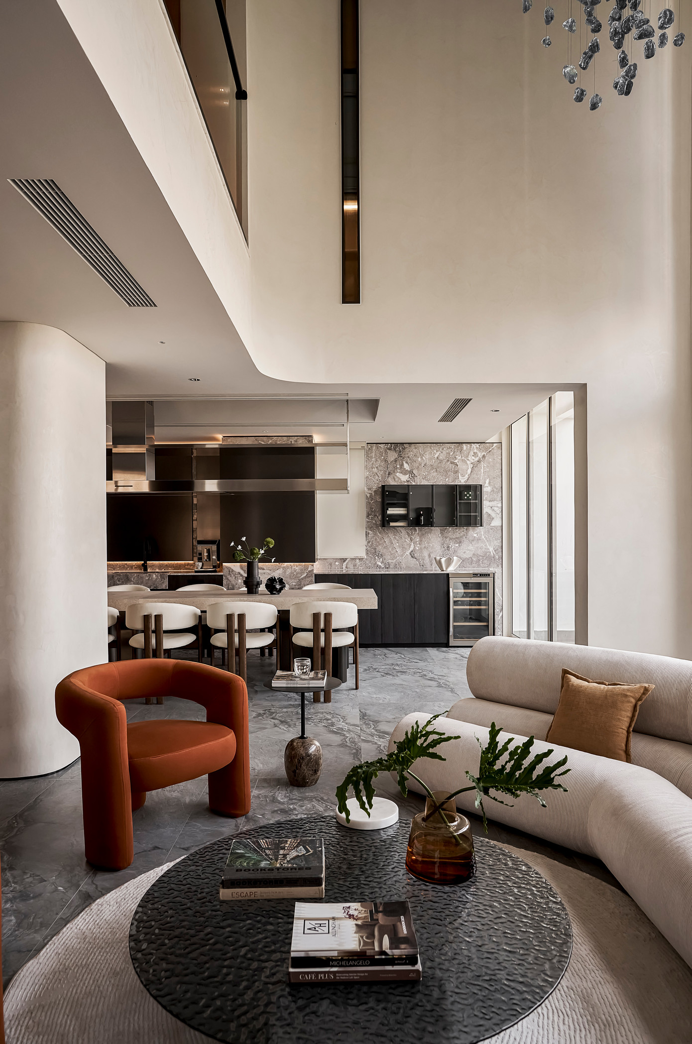Từ việc phân tích kỹ lưỡng tình trạng thực tế và mong muốn của gia chủ, New Noir Design lựa chọn giữ lại kết cấu ban đầu của căn penthouse. Trên tổng diện tích sử dụng 250m2 kiến trúc sư đã phân chia các khu công năng chung - riêng hợp lý xung quanh hạt nhân là không gian thông tầng.