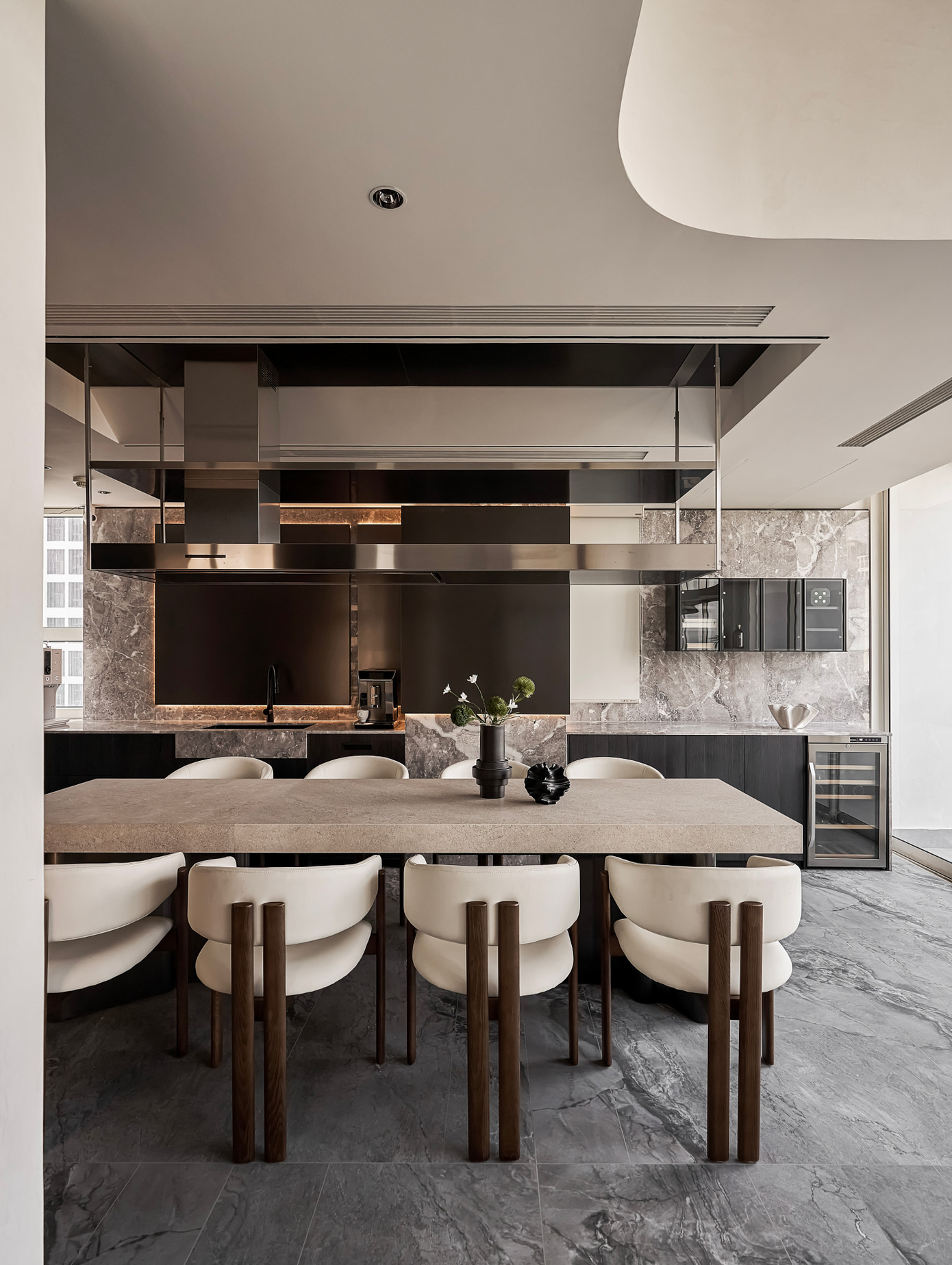 Bên cạnh phòng khách, bếp cũng là không gian được kiến trúc sư đưa vào nhiều điểm nhấn thiết kế. Hệ bếp từ vô hình Velacucina tới từ Upscale mang lại sự tiện nghi và sang trọng tối đa. Trung tâm bếp là bộ bàn ăn lớn cho 10 người.