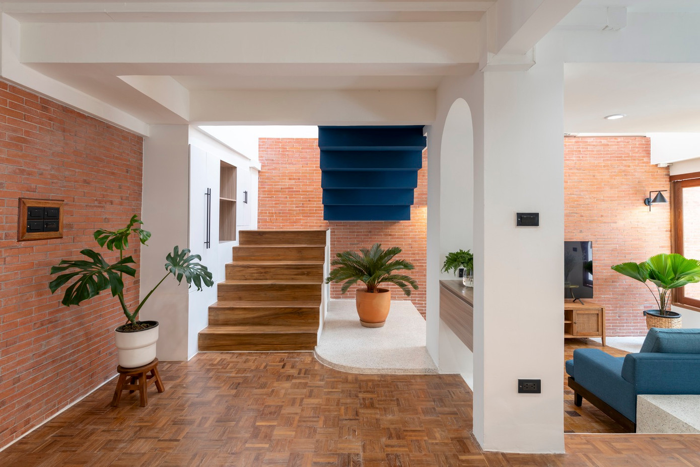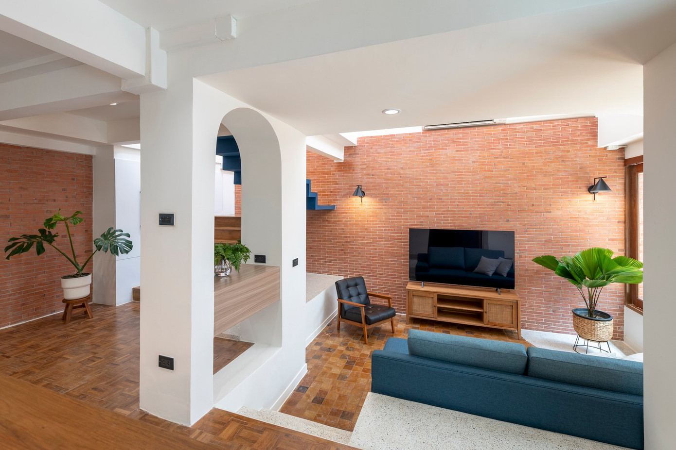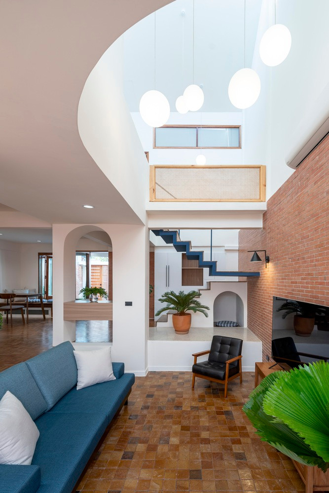 Để giúp ngôi nhà có cảm giác nhẹ nhàng hơn mà không làm gián đoạn cấu trúc ban đầu của nó. Cách phối màu được giữ ở mức tối thiểu với tông màu trắng và làm ấm bằng cách sử dụng các vật liệu phản ánh thiên nhiên, chẳng hạn như gạch, ngói và gỗ kết nối liền mạch giữa ngoại thất và nội thất.