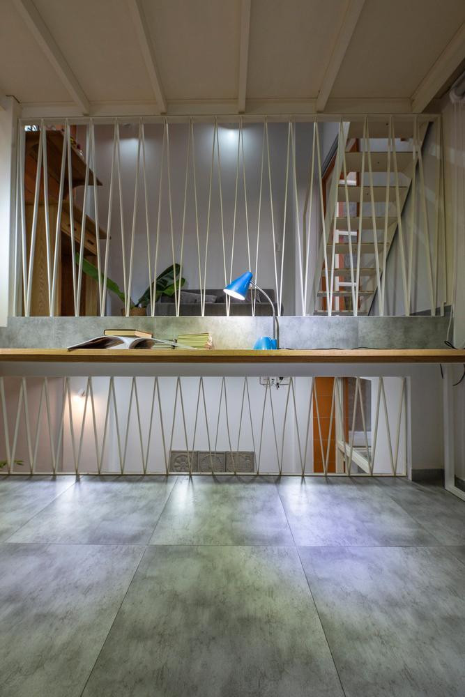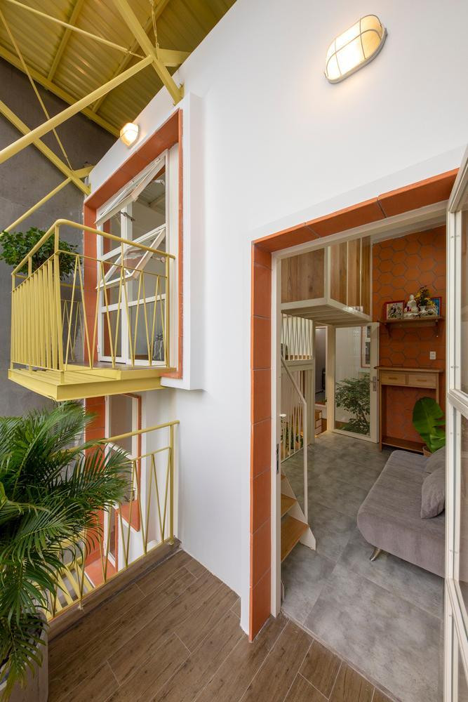 Để tối đa hóa không gian sống và tạo nơi giải trí cho cậu con trai nhỏ, gia chủ thiết kế phòng ngủ, phòng học và phòng chơi của cậu bé ở các vị trí lệch tầng. Điều này dẫn đến hai ban công của hai tầng nhà nằm lệch nhau và cùng nhìn ra phía sân trước.