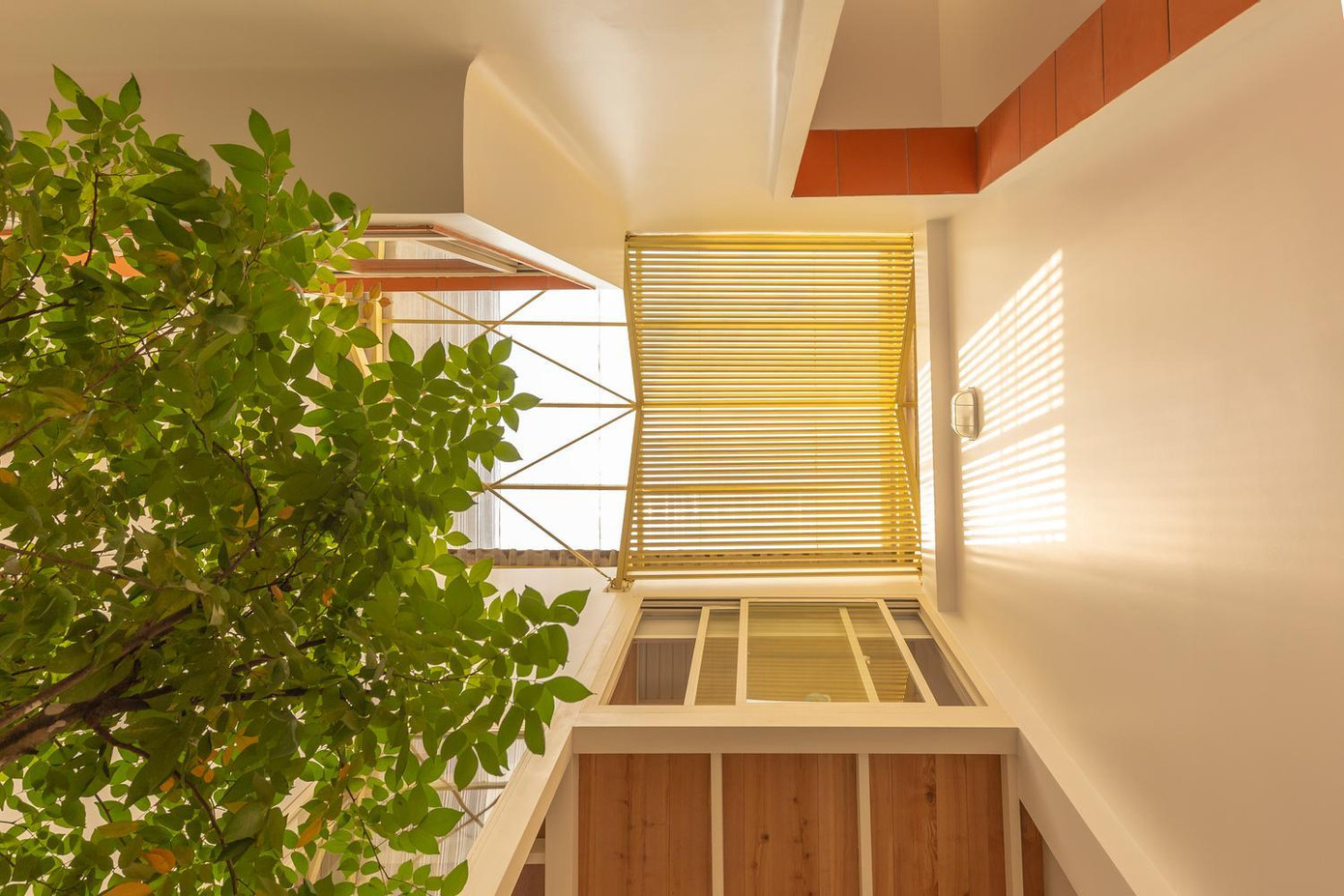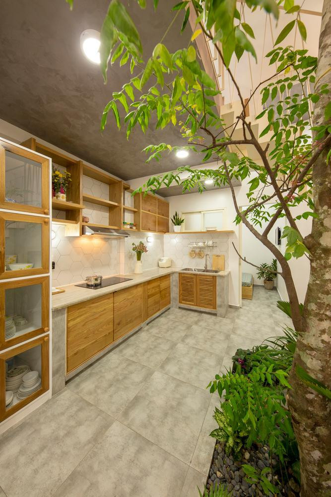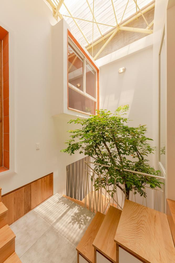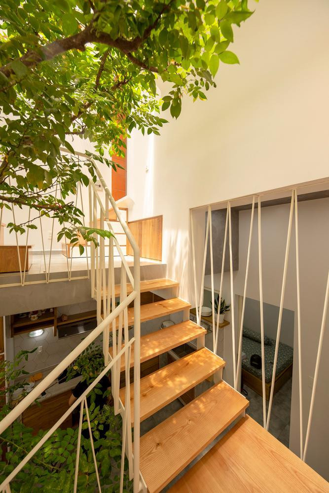 Cầu thang nhà vòng qua một cây khế được trồng bên dưới giếng trời để ngôi nhà vừa có ánh nắng vừa có sự xanh mát của cây cối.