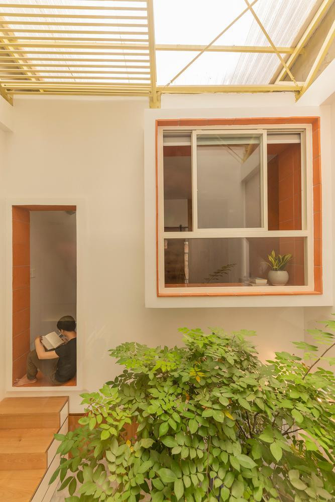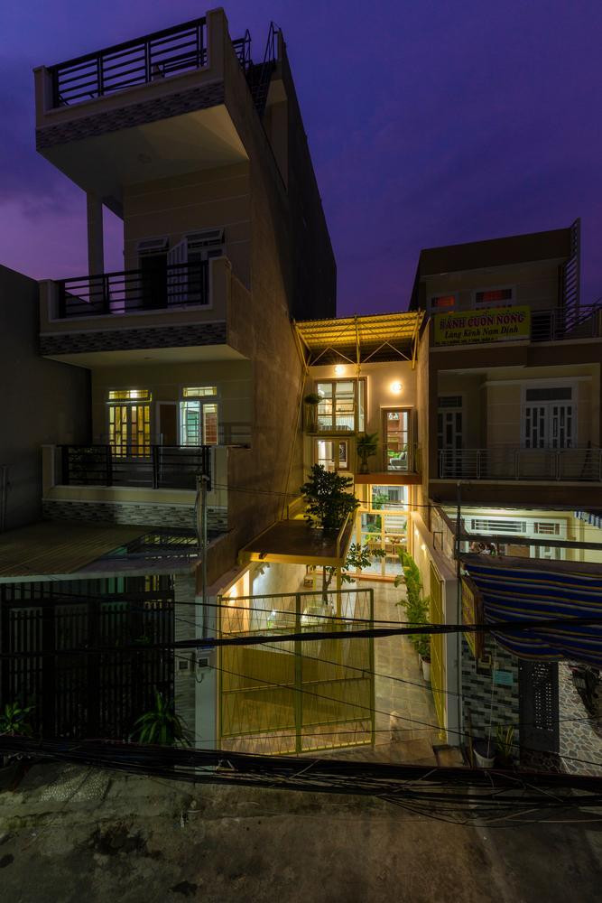 Vì nằm trên diện tích đất dài và hẹp nên căn nhà lùi sâu vào trong, khoảng đất phía mặt đường được thiết kế làm sân và nơi bán nước.