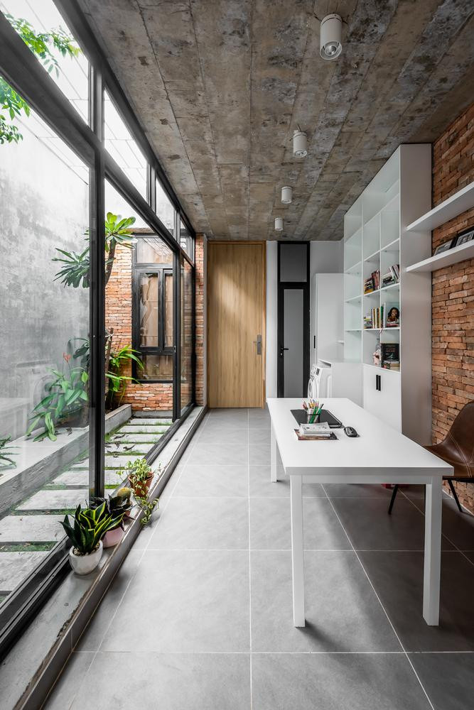 | Sân giữa nằm cạnh không gian phòng bếp và phòng làm việc. Được ngăn cách bằng các bức tường kính trượt, giúp cho không gian trong nhà luôn tràn ngập ánh sáng và lưu thông không khí. |