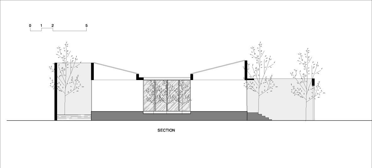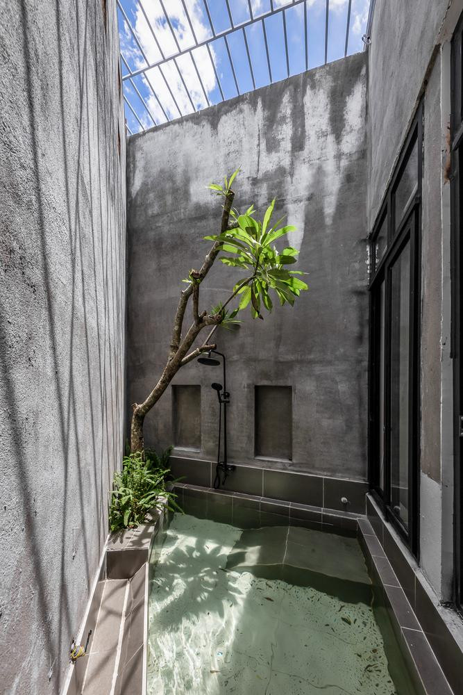 | Sân sau là hồ nước chạy dọc phòng ngủ và nhà vệ sinh. Cũng như sân giữa, phòng ngủ và nhà vệ sinh được ngăn cách với hồ nước bằng các tường kính trượt có thể mở ra đóng vào. Trong hồ nước có vòi hoa sen ngoài trời nên gia chủ có thể thoải mái hòa mình vào làn nước. |