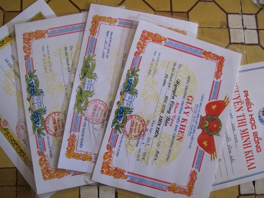 Bỏ lửng câu nói, bà khom người lục lại một số giấy khen, giấy nhận học bổng hằng năm quận cấp cho Bảo. Bà kể: “Nhà nghèo, năm nào trên quận cũng cấp một suất học bổng giúp học sinh vượt khó vươn lên. Năm qua, nó còn nhận được 700.000 đồng tiền may đồng phục”.