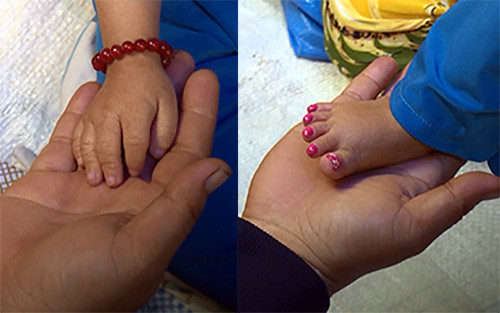 Tay và chân của thiếu nữ tí hon rất nhỏ so với người bình thường. Ảnh: Cửu Long