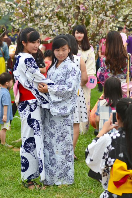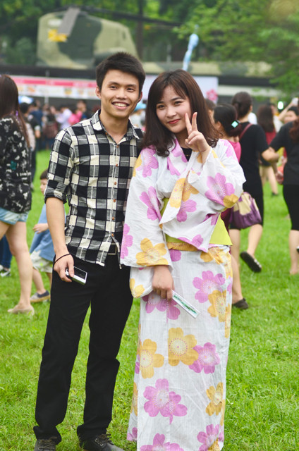 Các bạn trẻ đã tranh thủ cơ hội này để chụp ảnh cùng hoa anh đào trong bộ trang phục Yukata truyền thống của Nhật Bản.