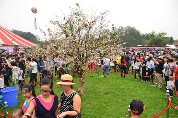 Hoa anh đào được đưa về từ Nhật Bản trang trí trong khu vực bãi cỏ của Hoàng Thành thu hút hàng nghìn bạn trẻ Thủ đô chụp ảnh, thăm quan.