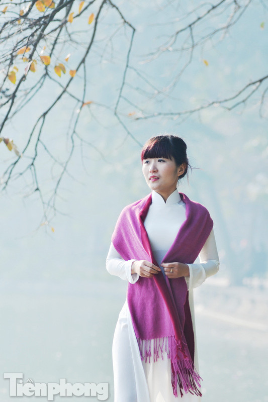Một thiếu nữ Hà thành diện áo dài trắng tạo dáng bên hồ Gươm đã thu hút ánh nhìn của bao người đi đường.