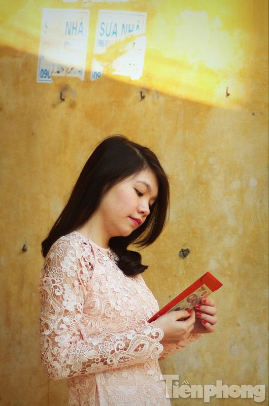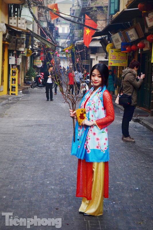 Tạo dáng cùng bao lì xì và cành đào trên phố Tạ Hiện