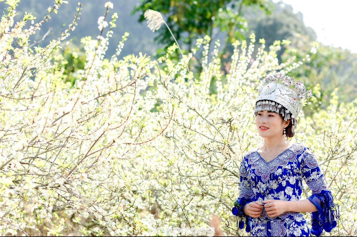Thiếu nữ làm duyên bên những chùm hoa mận trắng muốt.