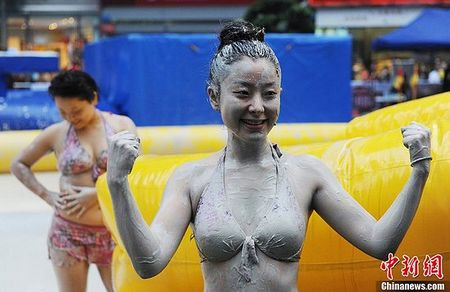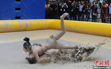 Thay vì thi đấu trên những võ đài thông thường, những cô gái tham dự cuộc thi đấu vật đặc biệt vừa diễn ra tại Trung Quốc tuần trước thi đấu trên những… vũng bùn, trong bộ trang phục bikini “nóng bỏng”.