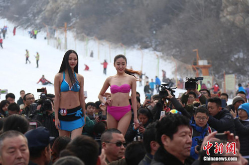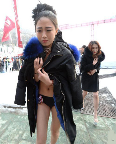 Các cô gái cuộc thi "Mỹ nhân băng tuyết" phải diện bikini và trình diễn ngoài trời, giữa thời tiết lạnh âm 3 độ C. để giành phần thưởng 10.000 nhân dân tệ (gần 35 triệu đồng).