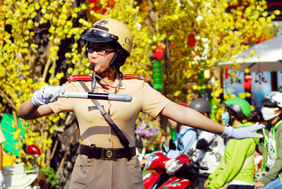 Nữ CSGT làm nhiệm vụ trong bầu trời xuân