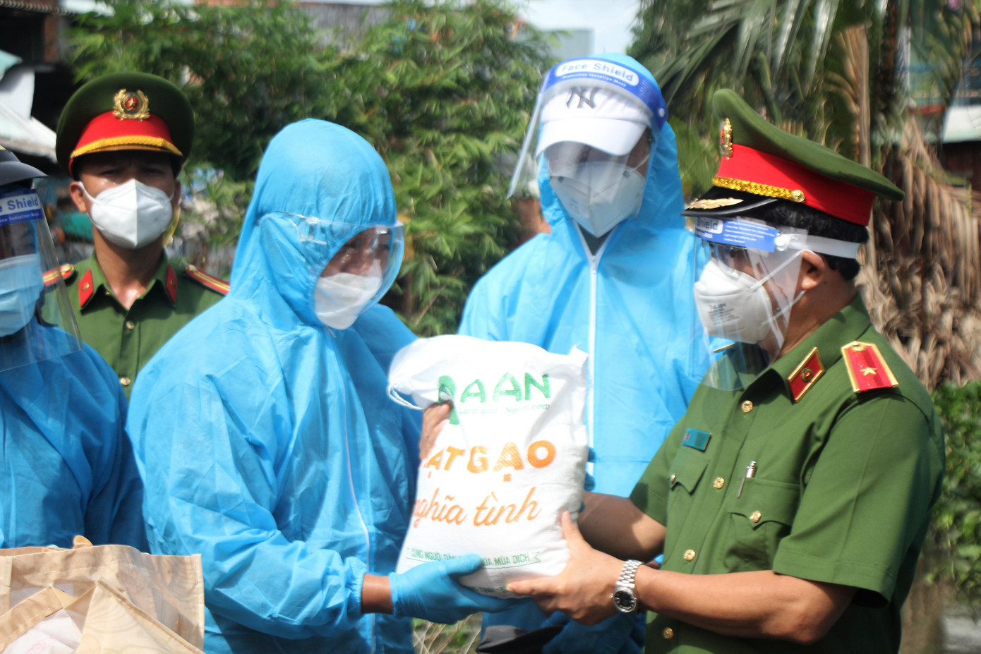 | Phó Giám đốc Công an TPHCM, Thiếu tướng Trần Đức Tài trao túi quà nhu yếu phẩm cho một người dân ngụ ở đường 47, khu phố 6, phường Hiệp Bình Chánh (TP. Thủ Đức). |
