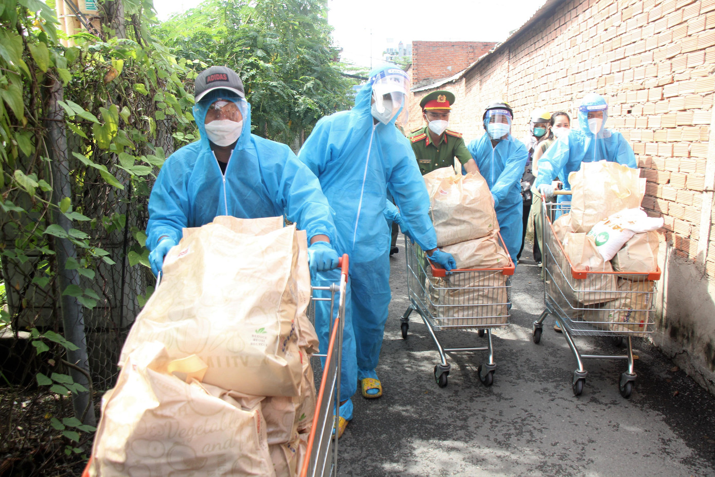 | Cán bộ chiến sỹ Công an TP. Thủ Đức bốc dỡ các phần quà lên phương tiện xe đẩy để đưa vào các hẻm nhỏ và trao cho người dân. |