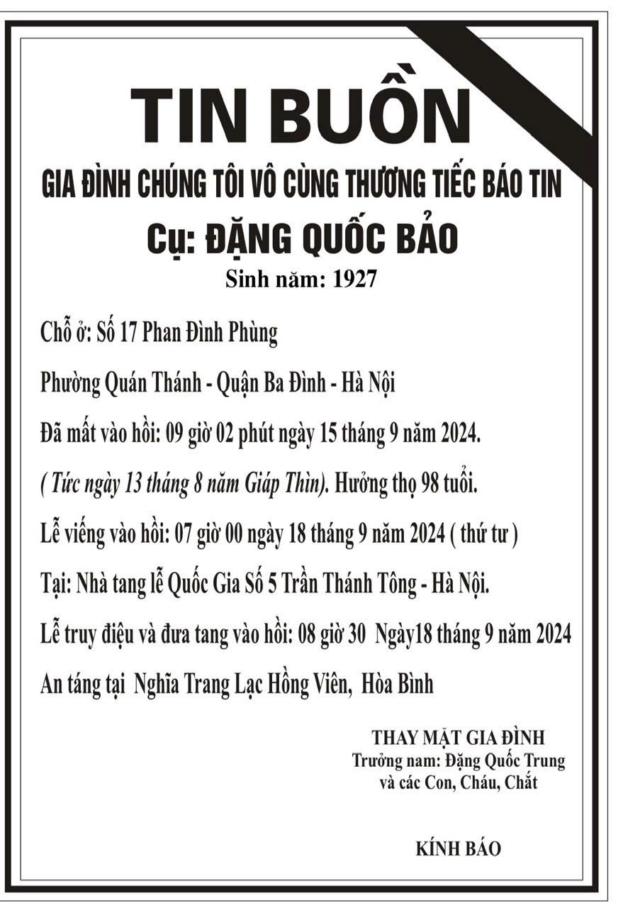 Theo thông tin từ gia đình, lễ viếng Thiếu tướng Đặng Quốc Bảo vào hồi 7h ngày 18/9 tại Nhà tang lễ Quốc gia, số 5 Trần Thánh Tông, Hà Nội.