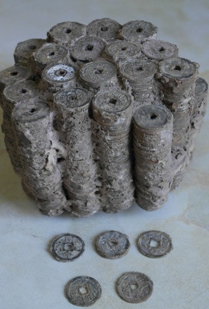 Ngay sau đó, ông Hoàng điện thoại cho cơ quan chức năng đến kiểm tra và xác minh niên đại của những đồng tiền cổ này. Qua kiểm tra, cơ quan chức năng xác định khối tiền cổ trên dính lại thành cục được cân nặng 4,5 kg, đục vài miếng tiền kiểm tra phát hiện có 2 loại tiền thời Minh Mạng và Gia Long.