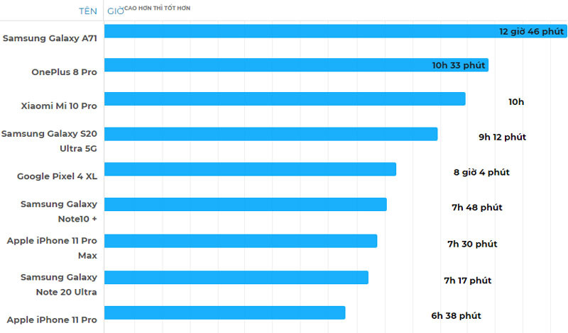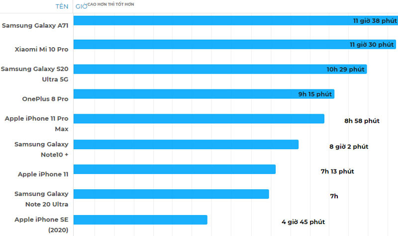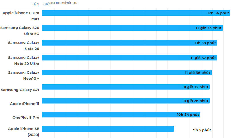 Tuy nhiên, thời lượng duyệt web của Galaxy Note 20 Ultra lại kém 57 phút so với iPhone 11 Pro Max. Tuy có dung lượng pin chỉ 3.969 mAh nhưng smartphone đầu bảng của Apple lại có màn hình nhỏ hơn 0,4 inch so với đối thủ đến từ Samsung.