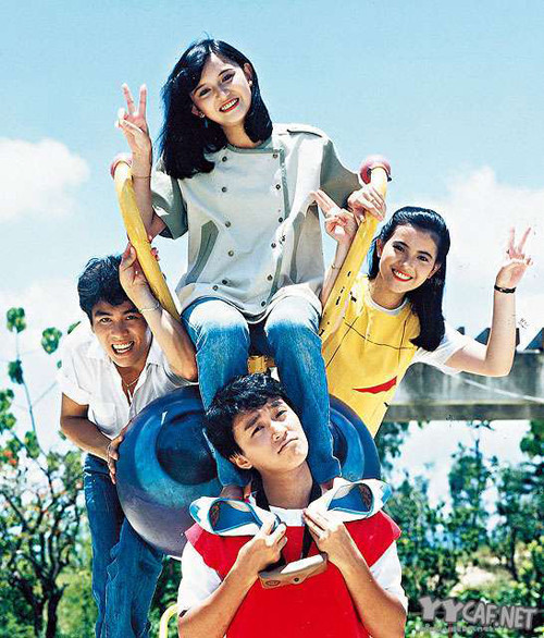 Châu Tinh Trì (áo đỏ), Lam Khiết Anh (áo vàng) cùng Tăng Hoa Thiên, Long Bỉnh Cơ thời mới vào lớp đào tạo của TVB.