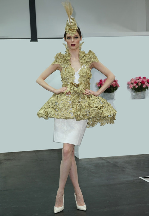 "Nữ hoàng tạo dáng" mặc áo Anthony Capon cầu kỳ bên ngoài chiếc váy trắng, bổ sung bằng chiếc mũ cùng chất liệu.