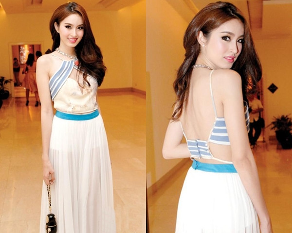 Thiết kế cut-out giúp cô khoe vai trần và tấm lưng trắng mịn, thu hút mọi ánh nhìn mà không hề tạo ra sự phản cảm.
