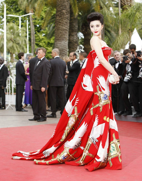 Năm 2011, Phạm Băng Băng ghi dấu ấn trên thảm đỏ Cannes với thiết kế in hình 9 con chim hạc của Christopher Bu (Bốc Kha Văn).