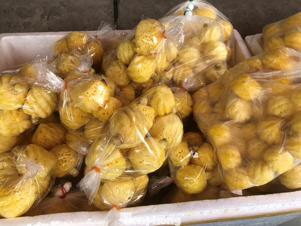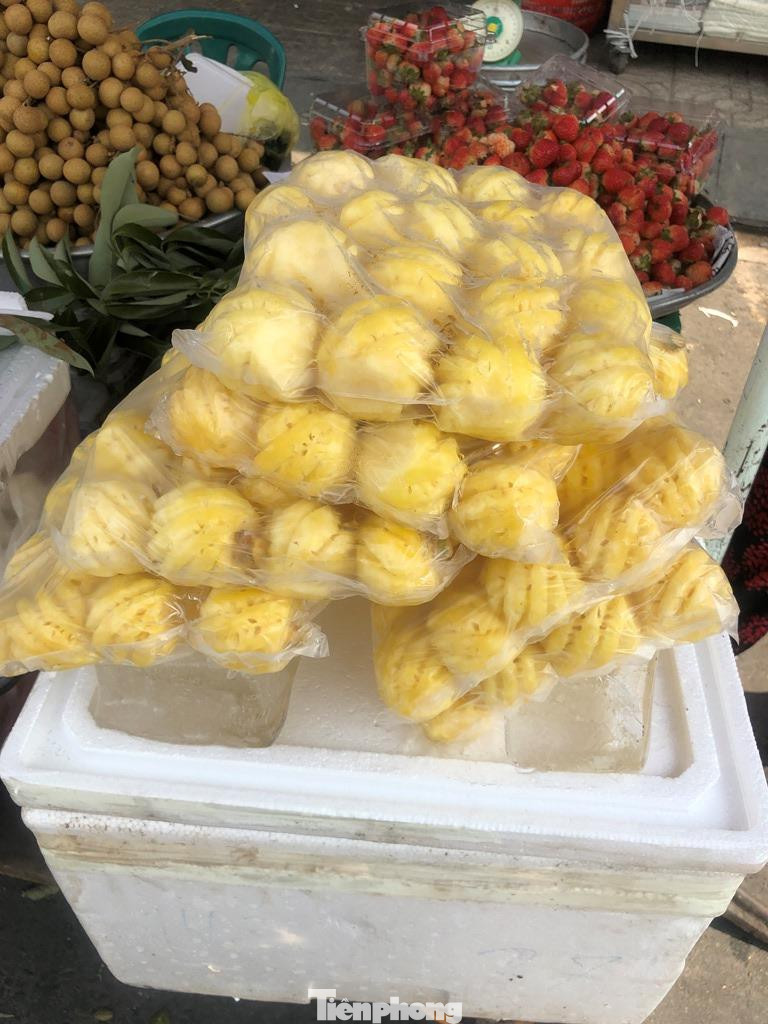 Đa số những người bán nơi đây đều không cân thơm mini theo ký mà bán theo bịch đã đóng sẵn. Quan sát trong quầy, chúng tôi thấy tiểu thương lấy từng bịch thơm đã gọt vỏ, đóng vào bịch nhựa không có tem nhãn, bao bì. Tất cả được ướp lạnh trong thùng xốp, bên ngoài có vài chữ bằng tiếng Thái Lan viết nguệch ngoặc bằng bút lông (?!).