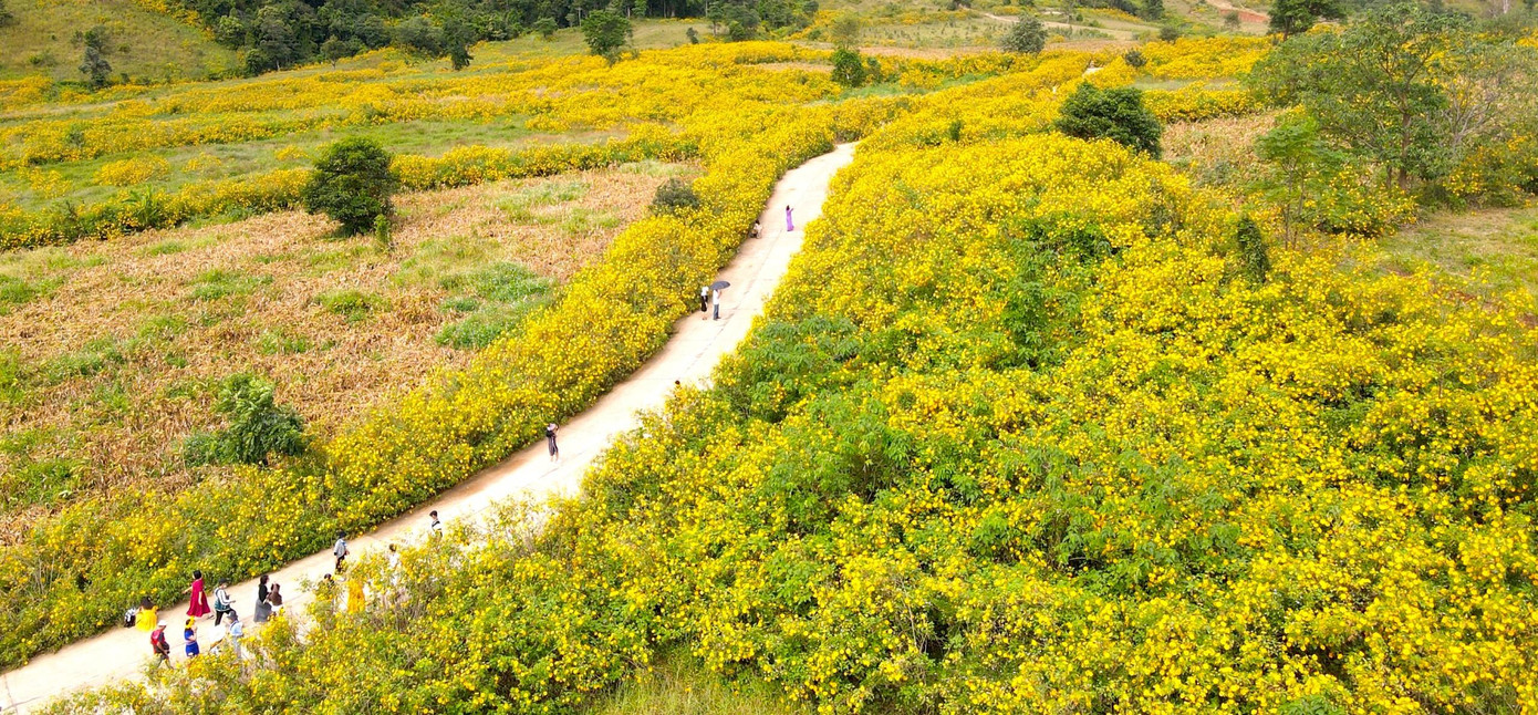 | Mùa này những cung đường ở Gia Lai đều được phủ màu vàng của hoa dã quỳ. |