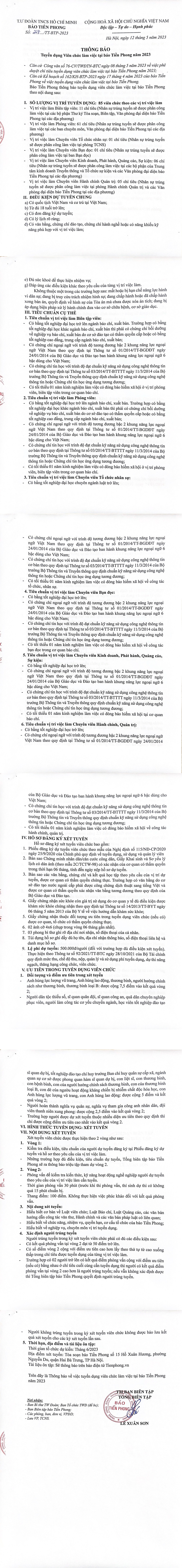 - Nơi nhận hồ sơ: Phòng Tổ chức nhân sự, Báo Tiền Phong, 15 Hồ Xuân Hương, phường Nguyễn Du, quận Hai Bà Trưng, Hà Nội.