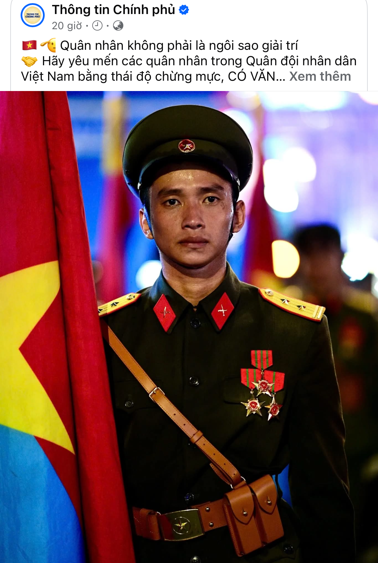 Cụ thể, trong bài đăng mới đây, fanpage Thông tin Chính phủ nhấn mạnh: “Quân nhân không phải là ngôi sao giải trí. Hãy yêu mến các quân nhân trong Quân đội nhân dân Việt Nam bằng thái độ chừng mực, có văn hóa.”