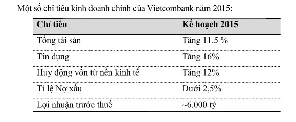 Ông Phạm Quang Dũng, Tổng giám đốc Vietcombank nhìn nhận: năm 2014 là năm thành công của Vietcombank. Ông Dũng nhấn mạnh bước sang năm 2015 Vietcombank sẽ tăng tốc phấn đấu đạt lợi nhuận trước thuế tối thiểu 6000 tỷ đồng; đặt mục tiêu dẫn đầu thị trường bán lẻ; đảm bảo duy trì vị thế NHTM đứng đầu kinh doanh vốn trên thị trường; rà soát củng cố các công ty con; Xây dựng phương án mua bán sáp nhập theo đề án tái cơ cấu NHNN đã phê duyệt; theo đúng chủ trương lộ trình.