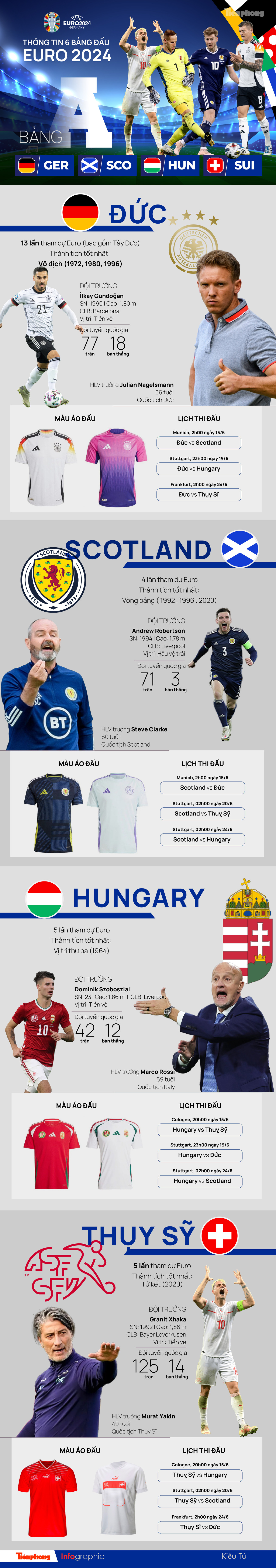 TPO - Bảng A UEFA Euro 2024 gồm tuyển Đức, Scotland, Hungary, Thụy Sỹ. Chủ nhà Đức được giới chuyên môn đánh giá cao nhưng không thể chủ quan với những đối thủ cùng bảng.