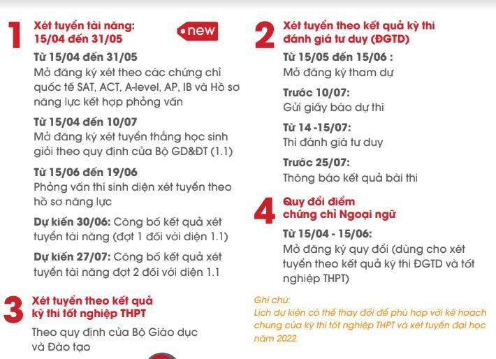 Theo đó, trường dự kiến tuyển mới 7.990 sinh viên, theo 3 phương thức tuyển sinh. Chỉ tiêu được phân bổ cho từng phương thức là: Xét tuyển tài năng, 10 - 20%; dựa theo kết quả kỳ thi đánh giá tư duy, 50 - 60%; dựa theo kết quả thi tốt nghiệp THPT, 30 - 40%.