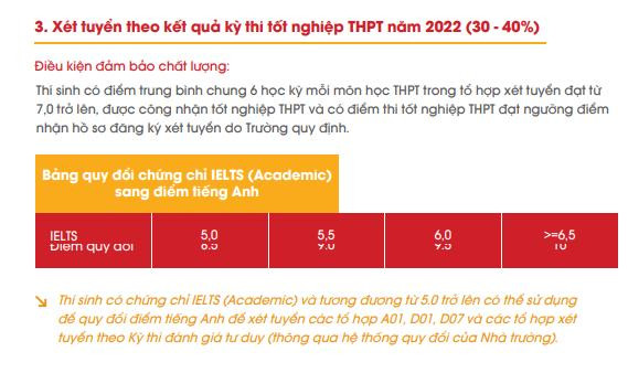 * Điều kiện dự tuyển: Thí sinh được công nhận tốt nghiệp THPT, riêng đối với phương thức (b) và (c): Điểm trung bình chung học tập từng năm học lớp 10, 11 và 12 đạt từ 8,0 trở lên. Phương thức (g) và (c) chỉ áp dụng đối với thí sinh tốt nghiệp THPT năm 2022.
