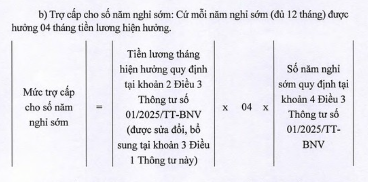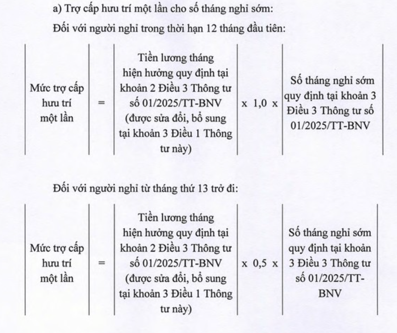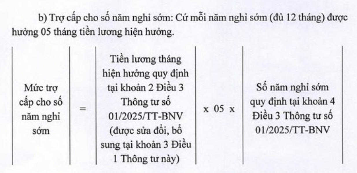 Theo thông tư mới này, trường hợp có tuổi đời còn từ đủ 2 năm đến đủ 5 năm đến tuổi nghỉ hưu, được hưởng 3 khoản trợ cấp, gồm: Trợ cấp hưu trí một lần cho số tháng nghỉ sớm; trợ cấp cho số năm nghỉ sớm - cứ mỗi năm nghỉ sớm (đủ 12 tháng) được hưởng 5 tháng tiền lương hiện hưởng; trợ cấp theo thời gian công tác có đóng bảo hiểm xã hội bắt buộc.