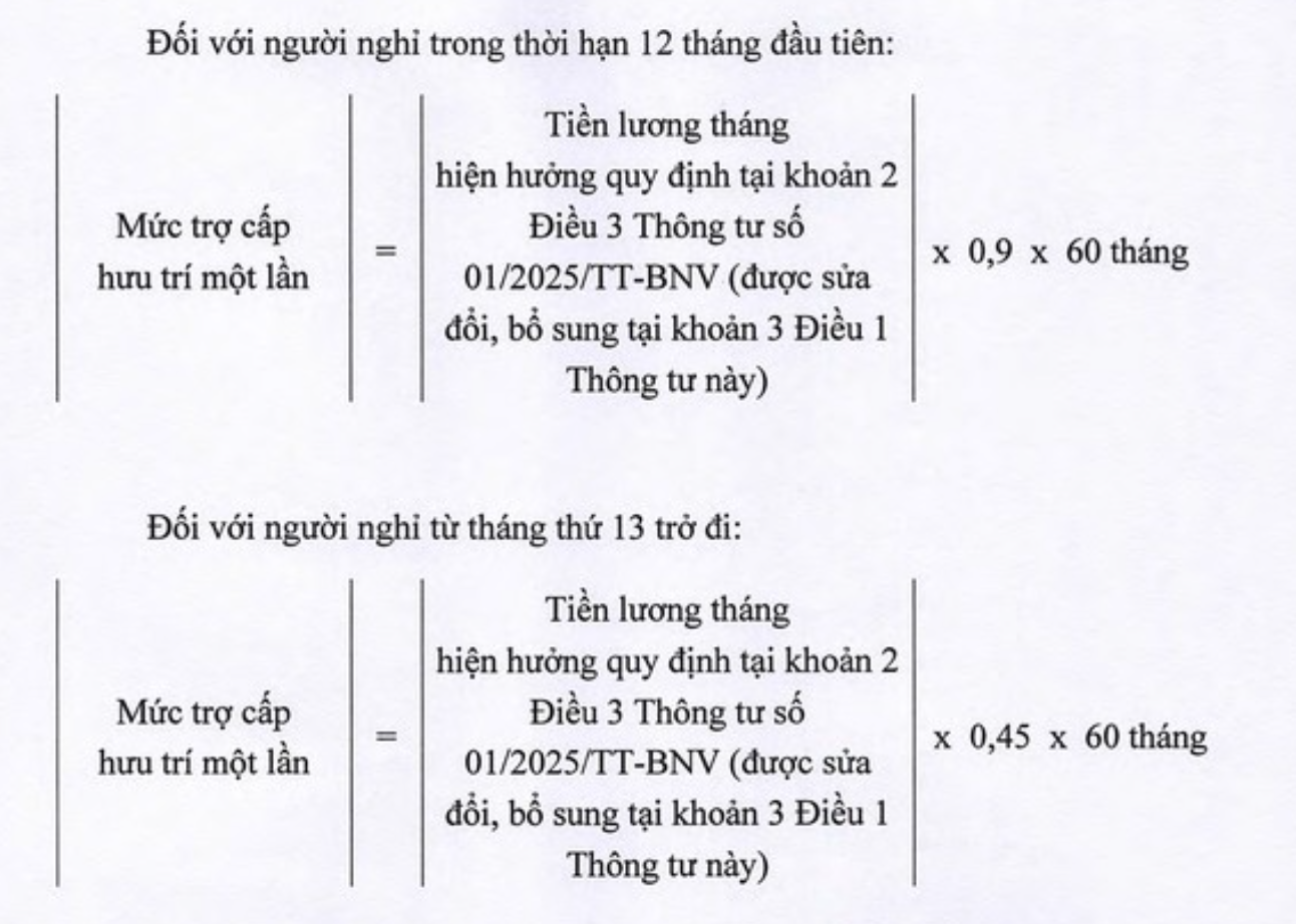 Đối với những người nghỉ trước ngày Luật Bảo hiểm xã hội năm 2024 có hiệu lực thi hành (trừ nữ cán bộ, công chức cấp xã) thì mức trợ cấp được tính như sau: 20 năm đầu công tác có đóng bảo hiểm xã hội bắt buộc được trợ cấp 5 tháng tiền lương hiện hưởng; đối với số năm còn lại (từ năm thứ 21 trở đi), mỗi năm được trợ cấp bằng 0,5 tháng tiền lương hiện hưởng.