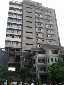 Công trình xây dựng cao tầng nhưng không có hệ thống lưới bảo vệ  Ảnh: Duy Chiến