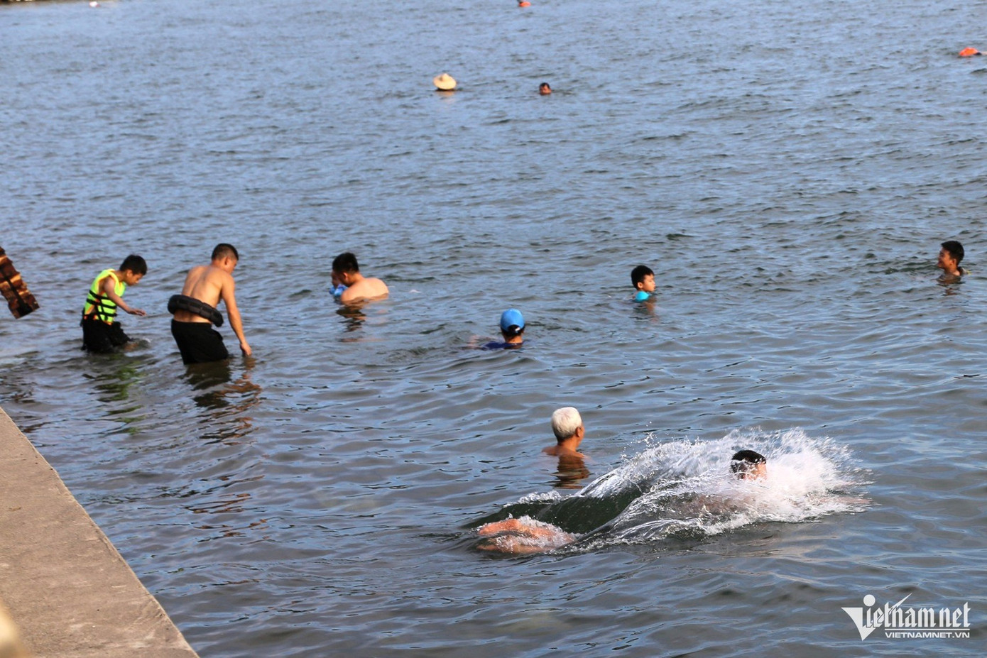 Đây là khu vực có nhiều tàu thuyền qua lại, nhưng người dân vẫn bất chấp, bơi ra xa bờ. Nhiều người còn tận dụng chai nhựa để làm phao bơi.