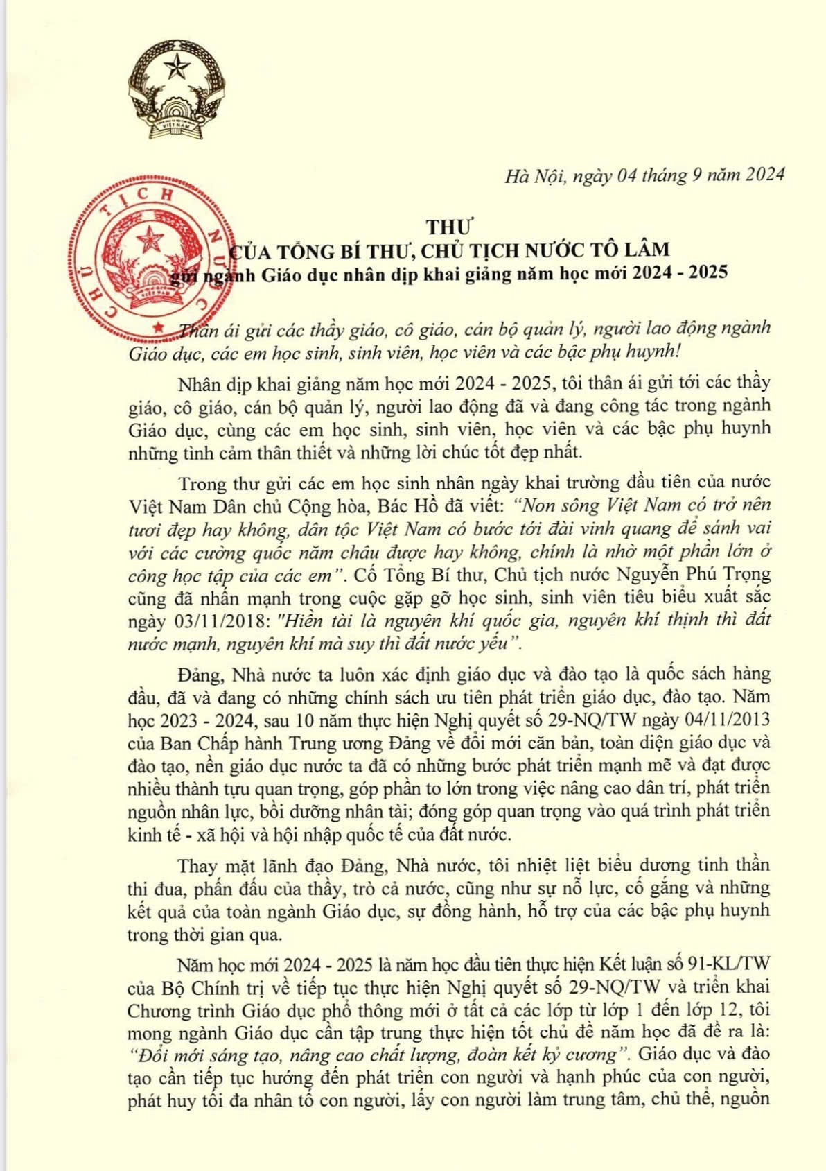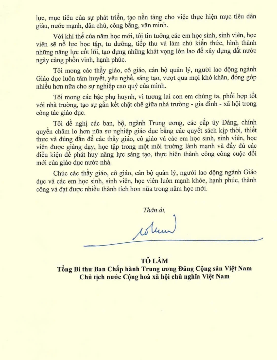 Chúc các thầy giáo, cô giáo, cán bộ quản lý, người lao động ngành Giáo dục và các em học sinh, sinh viên, học viên luôn mạnh khỏe, hạnh phúc, thành công và đạt được nhiều thành tích hơn nữa trong năm học mới", thư của Tổng Bí thư, Chủ tịch nước Tô Lâm viết.