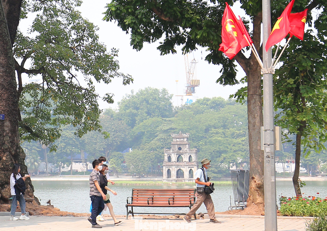 Người dân tản bộ quanh hồ Hoàn Kiếm trong tiết trời trong xanh