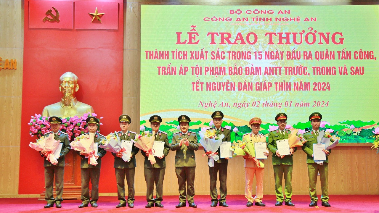 Ngày 2/1, Công an tỉnh Nghệ An tổ chức Lễ trao thưởng thành tích xuất sắc trong 15 ngày đầu ra quân tấn công, trấn áp tội phạm bảo đảm an ninh trật tự (ANTT) trước, trong và sau Tết Nguyên đán Giáp Thìn 2024.