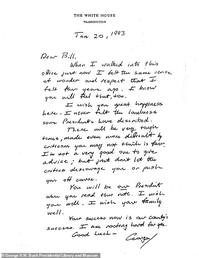 Vào thời điểm đọc lá thư này, ông đã là Tổng thống. Tôi chúc ông khỏe mạnh. Tôi chúc cho gia đình ông những điều tốt đẹp nhất. Thành công của ông giờ đã là thành công của toàn nước Mỹ. Tôi rất cổ vũ ông. Chúc may mắn. Kí tên: George.”