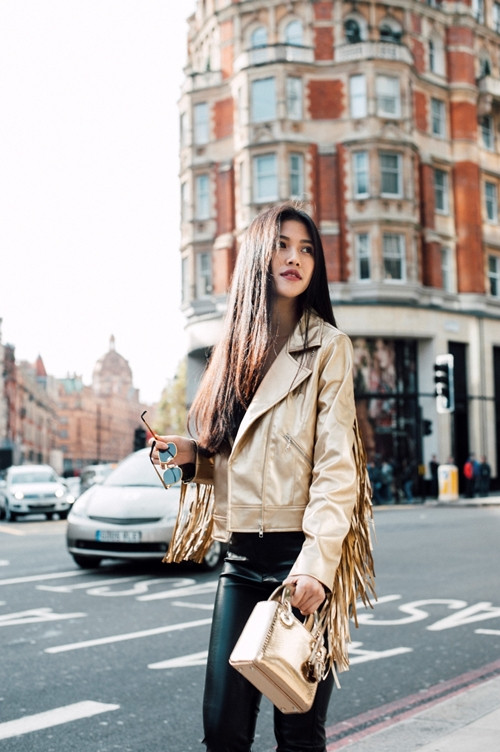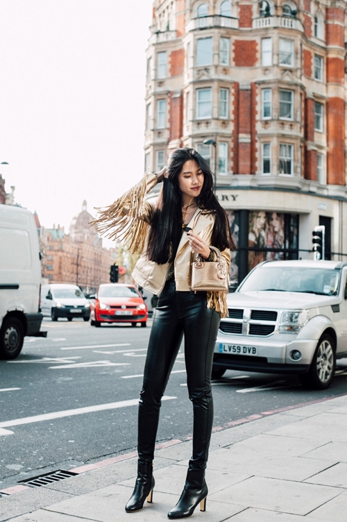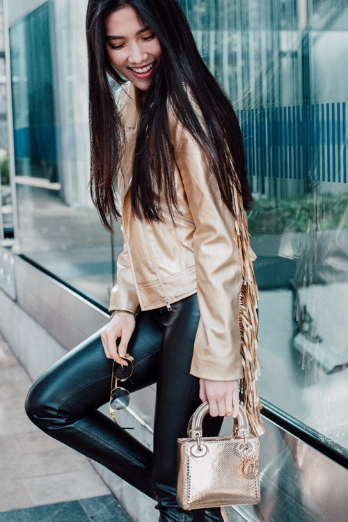 Tua rua là một trong những phong cách được nhiều tín đồ thời trang yêu thích nhưng khó phối đồ và kén người mặc. Thu Hằng chọn áo khoác tua rua váng ánh kim, phối cùng quần da bóng và bốt cao gót.
