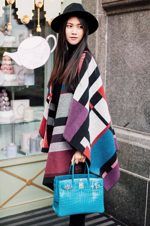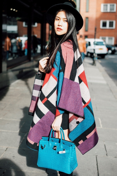 Thu Hằng khoác áo choàng poncho màu sắc của Burberry bên ngoài váy len ngắn trên gối, cùng tông với bốt cao cổ và mũ. Đây là chiếc áo choàng được nhiều tín đồ thời trang và sao Hollywood yêu thích.