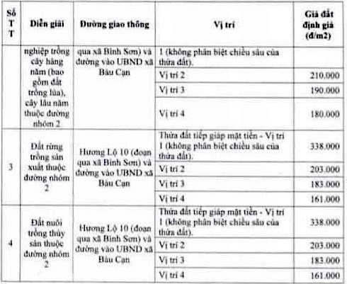 Giá bồi thường thấp nhất thuộc về đất nuôi trồng thủy sản ở Hương Lộ 10, đoạn qua UBND xã Bình Sơn và đường vào UBND xã Bàu Cạn. Cụ thể, đất ở vị trí 1 được bồi thường 338 ngàn đồng/m2, vị trí 2 là 203 ngàn đồng/m2, vị trí 3 là 183 ngàn đồng/m2, vị trí 4 là 161 ngàn đồng/m2.